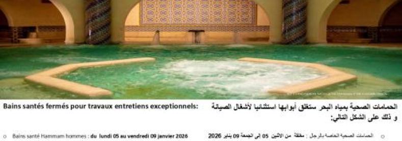 ننهي إلى علم زبنائنا الكرام بأن الحمامات الصحية للمسجد الحسن الثاني ستغلق أبوابها استثنائيا في وجه العموم نظرا لأشغال الصيانة و ذلك على الشكل التالي: