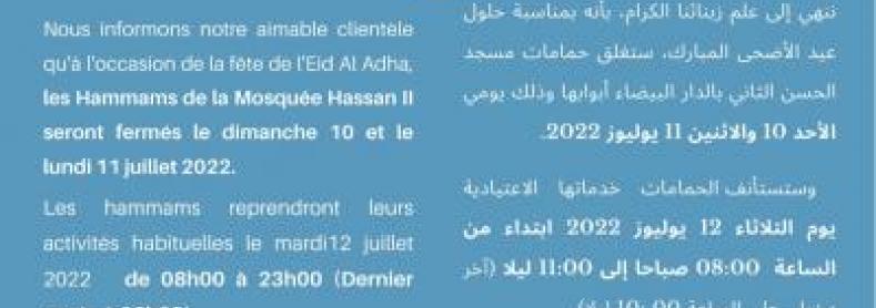 La Fondation de la Mosquée Hassan II de Casablanca informe son aimable clientèle qu'à l'occasion de la fête de l'Eid Al ADHA, les Hammams de la Mosquée Hassan II seront fermés le dimanche 10 et le lundi 11 Juillet 2022. Les Hammams reprendront leus activités habituelles à partir du mardi 12 Juillet 2022 de 08h00 à 23h00 (dernier accès à 22h00).